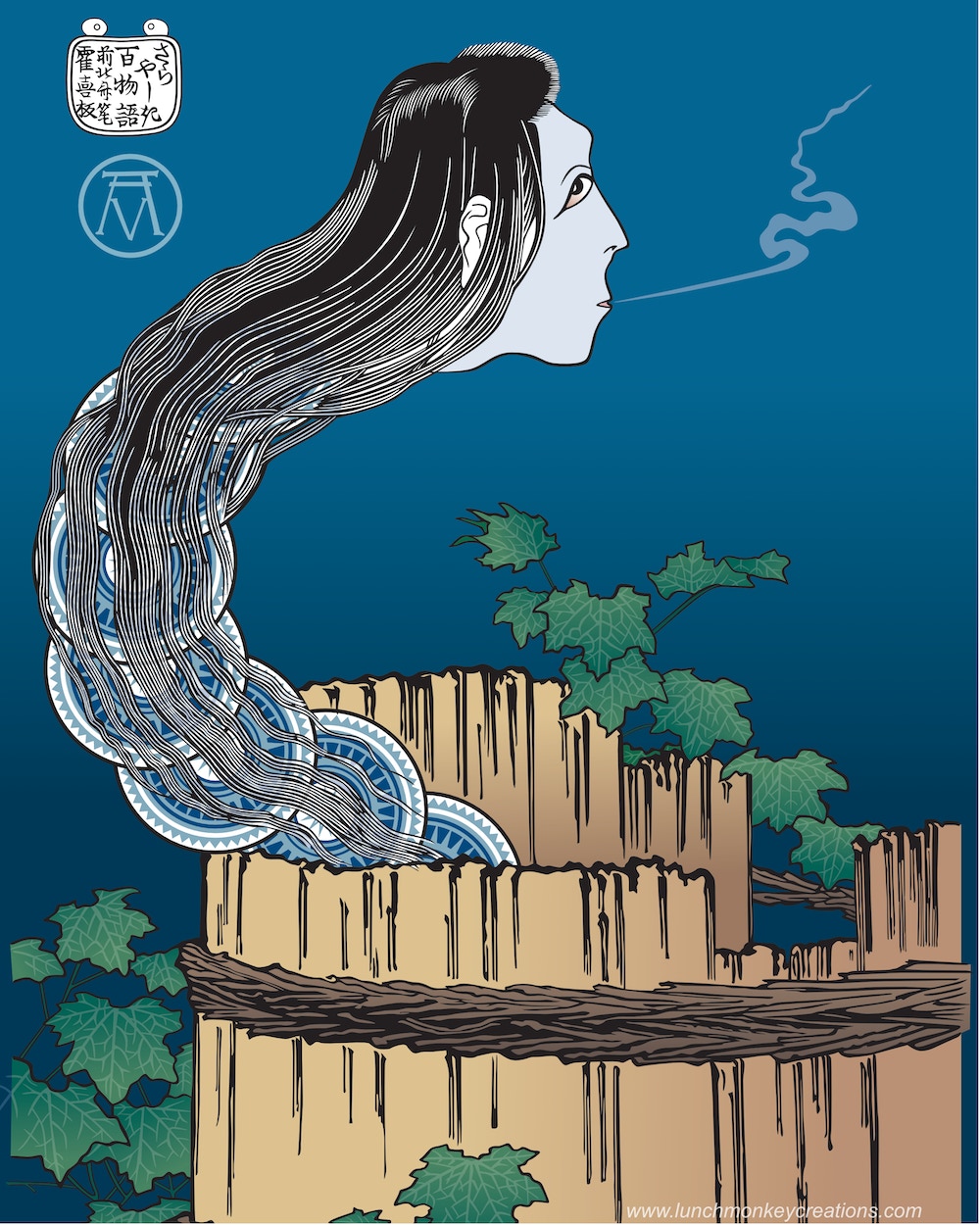 Bancho Sarayaski is an old and very famous Japanese ghost story and appears in many ukiyo-e prints by many different artists. The story is about Okiku, a servant girl who is very beautiful and who is pursued by the samurai that she works for. She rebuffs his advances time and time again so he tricks her into believing that she lost one of the manor’s rare and expensive plates. She franticly counts the plates and can’t understand what happened to the missing plate. She goes to the samurai and tells him that she lost one of the plates. He tells her that if she sleeps with him, he’ll forget about it but she refuses. The samurai gets angry and throws her down a well where later servants would report hearing a woman counting to nine and then screaming. This is my version of a print originally made by Hokusai.